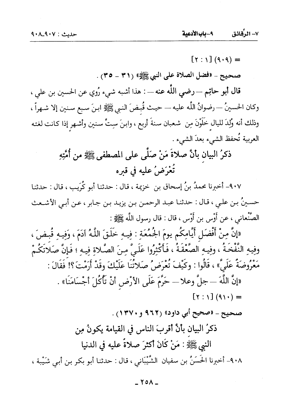 قَالَ أَبُو حَاتِمٍ رَضِيَ اللَّهُ عَنْهُ: فِي هَذَا الْخَبَرِ دَلِيلٌ عَلَى أَنَّ أَوْلَى النَّاسِ بِرَسُولِ اللَّهِ صَلَّى اللَّهُ عَلَيْهِ وَسَلَّمَ فِي الْقِيَامَةِ يَكُونُ أَصْحَابُ الْحَدِيثِ إِذْ لَيْسَ مِنْ هَذِهِ الْأُمَّةِ قَوْمٌ أَكْثَرَ صَلَاةٍ عَلَيْهِ صَلَّى اللَّهُ عَلَيْهِ وَسَلَّمَ مِنْهُمْ