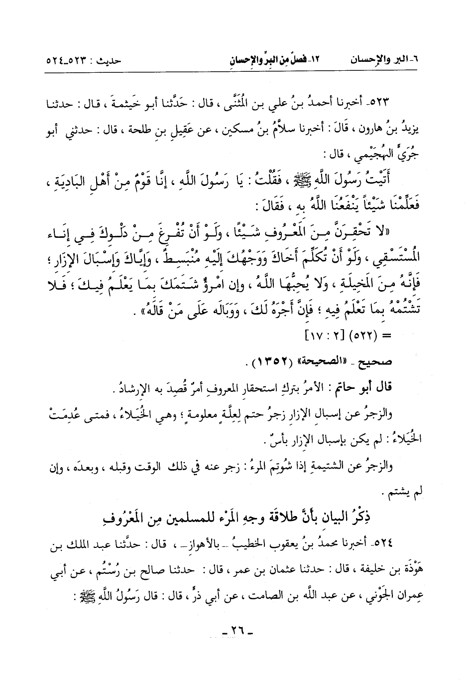 (لَا تَحْقِرَنَّ مِنَ الْمَعْرُوفِ شَيْئًا وَلَوْ أَنْ تُفْرِغَ مِنْ دَلْوِكَ فِي إِنَاءِ الْمُسْتَسْقِي وَلَوْ أَنْ تُكَلِّمَ أَخَاكَ وَوَجْهُكَ إِلَيْهِ مُنْبَسِطٌ وَإِيَّاكَ وَإِسْبَالَ الْإِزَارِ فَإِنَّهُ مِنَ الْمَخِيلَةِ وَلَا يُحِبُّهَا اللَّهُ وَإِنِ امْرُؤٌ شَتَمَكَ بِمَا يَعْلَمُ فِيكَ فَلَا تَشْتُمْهُ بِمَا تَعْلَمُ فِيهِ فَإِنَّ أَجْرَهُ لَكَ وَوَبَالَهُ عَلَى مَنْ قاله)