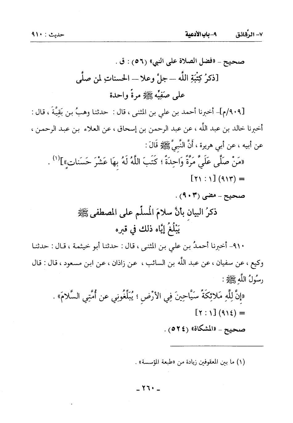 (إِنَّ لِلَّهِ مَلَائِكَةً سيَّاحين فِي الْأَرْضِ يُبَلِّغُوني عَنْ أُمَّتِي السلام)