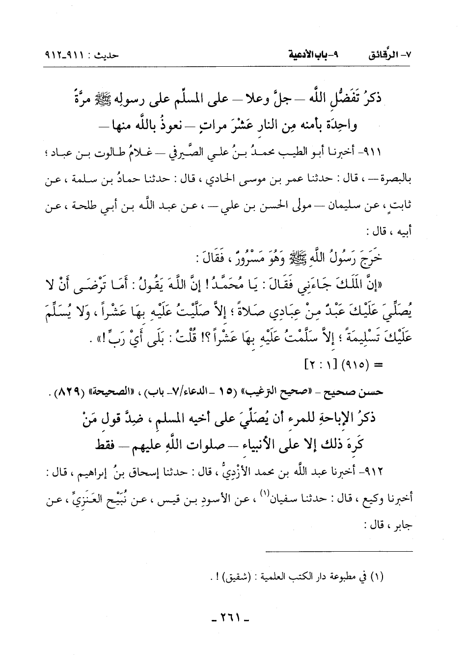 (إِنَّ المَلَكَ جَاءَنِي فَقَالَ: يَا مُحَمَّدُ إِنَّ اللَّهَ يَقُولُ: أَمَا تَرْضَى أَنْ لَا يُصَلِّي عَلَيْكَ عَبْدٌ مِنْ عِبَادِي صَلَاةً إِلَّا صَلَّيْتُ عَلَيْهِ بِهَا عَشْرًا وَلَا يُسَلِّمُ عَلَيْكَ تَسْلِيمَةً إِلَّا سَلَّمْتُ عَلَيْهِ بِهَا عَشْرًا؟ قُلْتُ: بلى أي رب)