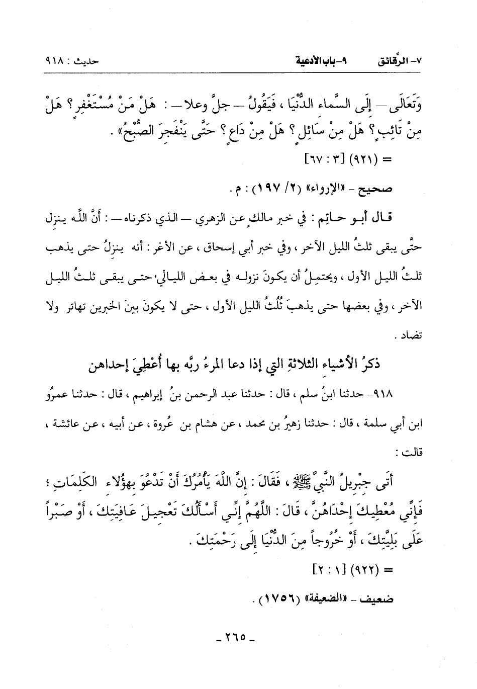 918 - حَدَّثَنَا ابْنُ سَلْمٍ قَالَ: حَدَّثَنَا عَبْدُ الرَّحْمَنِ بْنُ إِبْرَاهِيمَ قَالَ: حَدَّثَنَا عَمْرُو بْنُ أَبِي سَلَمَةَ قَالَ: حَدَّثَنَا زُهَيْرُ بْنُ مُحَمَّدٍ عَنْ هِشَامِ بْنِ عُرْوَةَ عَنْ أَبِيهِ عَنْ عائشة قَالَتْ: