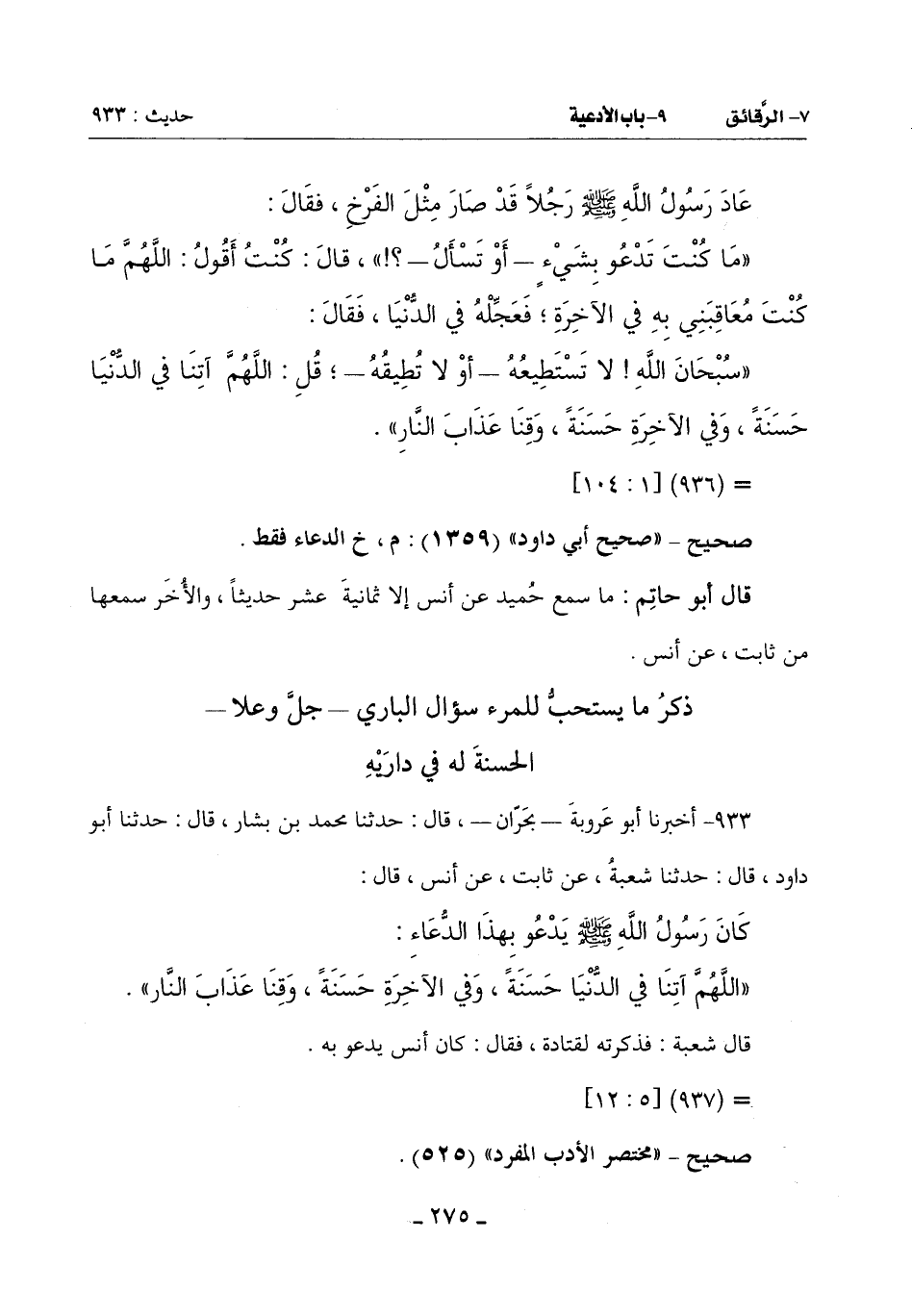 933 - أَخْبَرَنَا أَبُو عَرُوبَةَ بِحَرَّانَ قَالَ: حَدَّثَنَا مُحَمَّدُ بْنُ بَشَّارٍ قَالَ: حَدَّثَنَا أَبُو دَاوُدَ قَالَ: حَدَّثَنَا شُعْبَةُ عَنْ ثَابِتٍ عَنْ أَنَسٍ قَالَ: