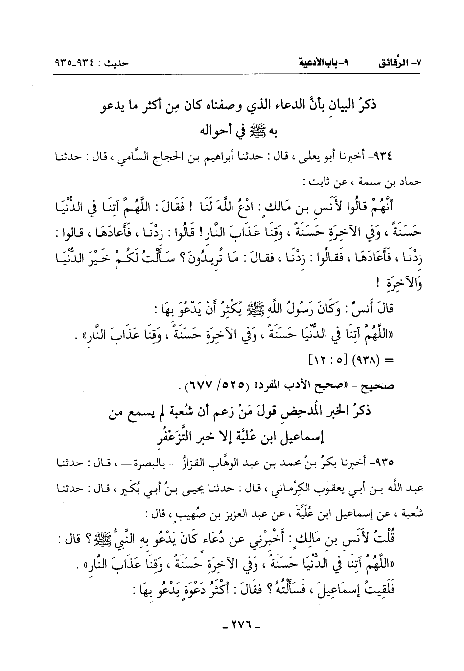 935 - أَخْبَرَنَا بَكْرُ بْنُ مُحَمَّدِ بْنِ عَبْدِ الْوَهَّابِ الْقَزَّازُ بِالْبَصْرَةِ قَالَ: حَدَّثَنَا عَبْدُ اللَّهِ بْنُ أَبِي يَعْقُوبَ الْكَرْمَانِيُّ قَالَ: حَدَّثَنَا يَحْيَى بْنُ أَبِي بُكَيْرٍ قَالَ: حَدَّثَنَا شُعْبَةُ عَنْ إِسْمَاعِيلَ بن عُلَيَّةَ عَنْ عَبْدِ الْعَزِيزِ بْنِ صُهَيْبٍ قَالَ: