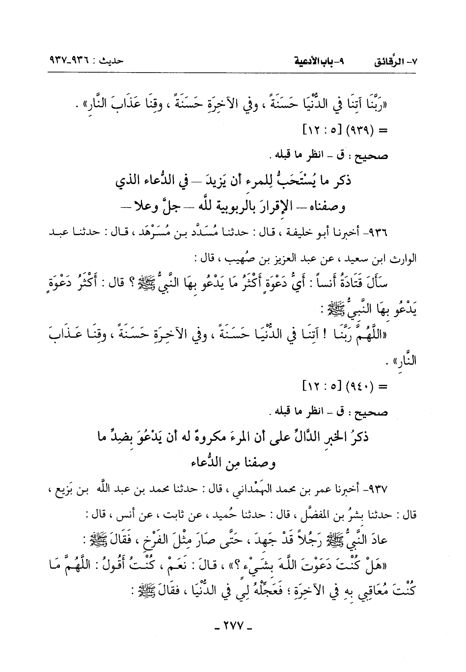 937 - أَخْبَرَنَا عُمَرُ بْنُ مُحَمَّدٍ الْهَمْدَانِيُّ قَالَ: حَدَّثَنَا مُحَمَّدُ بْنُ عَبْدِ اللَّهِ بْنِ بَزِيعٍ قَالَ: حَدَّثَنَا بِشْرُ بْنُ الْمُفَضَّلِ قَالَ: حَدَّثَنَا حُمَيْدٌ عَنْ ثَابِتٍ عَنْ أَنَسٍ قَالَ: