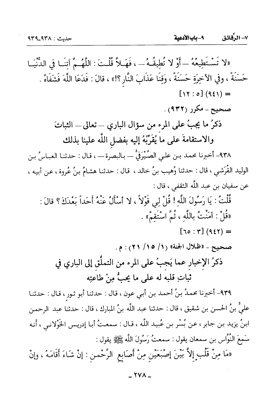 (مَا مِنْ قَلْبٍ إِلَّا بَيْنَ إِصْبَعَيْنِ مِنْ أَصَابِعِ الرَّحْمَنِ إِنْ شَاءَ أَقَامَهُ وَإِنْ -[279]- شَاءَ أَزَاغَهُ) قَالَ: وَكَانَ رَسُولُ اللَّهِ صَلَّى اللَّهُ عَلَيْهِ وَسَلَّمَ يَقُولُ: