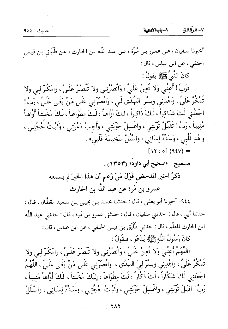 (اللَّهُمَّ أَعِنِّي وَلَا تُعِنْ عَلَيَّ وَانْصُرْنِي وَلَا تَنَصُرْ عَلَيَّ وَامْكُرْ لِي وَلَا تَمْكُرْ عَلَيَّ وَاهْدِنِي وَيَسِّرْ لِيَ الْهُدَى وَانْصُرْنِي عَلَى مَنْ بَغَى عَلَيَّ اللَّهُمَّ اجْعَلْنِي لَكَ شَكَّاراً لَكَ ذكَّاراً لَكَ مِطْوَاعاً إِلَيْكَ مُخْبِتًا لَكَ أوَّاهاً منبياً رَبِّ اقْبَلْ تَوْبَتِي وَاغْسِلْ حَوْبَتِي وَثَبِّتْ حُجتي وسدد لساني واسلل -[283]- سخيمة قلبي)