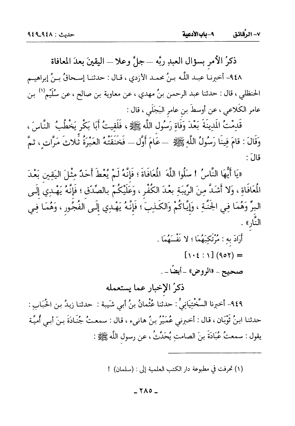 (يَا أَيُّهَا النَّاسُ سَلُوا اللَّهَ الْمُعَافَاةَ فَإِنَّهُ لَمْ يُعط أَحَدٌ مِثْلَ الْيَقِينِ بعد المعافاة ولا أشد من الربية بَعْدَ الْكُفْرِ وَعَلَيْكُمْ بِالصِّدْقِ فَإِنَّهُ يَهْدِي إِلَى الْبِرِّ وَهُمَا فِي الْجَنَّةِ وَإِيَّاكُمْ وَالْكَذِبَ فَإِنَّهُ يَهْدِي إِلَى الْفُجُورِ وَهُمَا فِي النَّارِ)