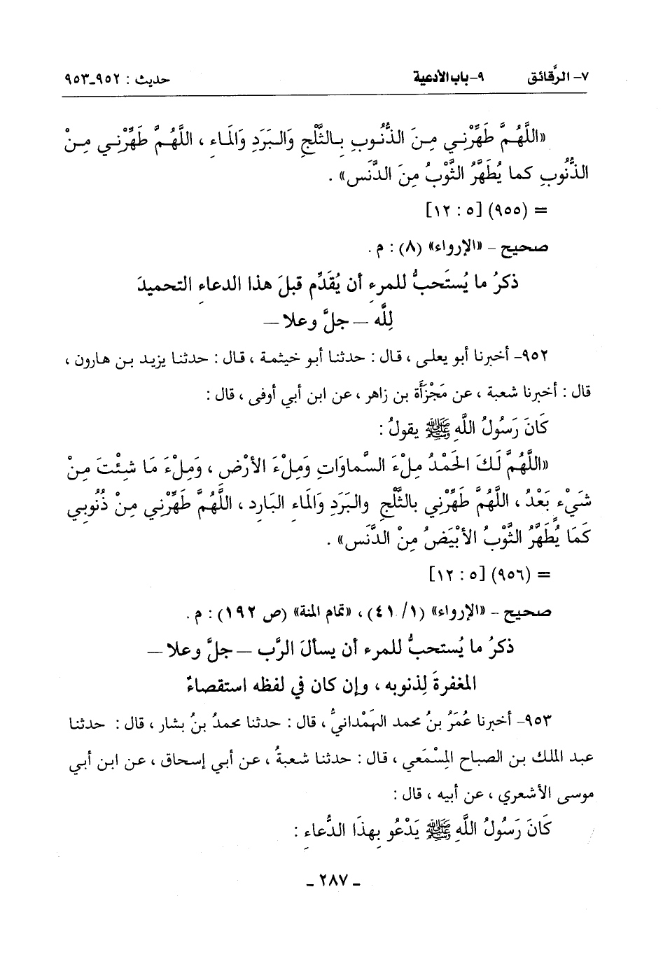 (اللَّهُمَّ لَكَ الْحَمْدُ ملء السموات وَمِلْءَ الْأَرْضِ وَمِلْءَ مَا شِئْتَ مِنْ شَيْءٍ بَعْدُ اللَّهُمَّ طَهِّرْنِي بِالثَّلْجِ وَالْبَرَدِ وَالْمَاءِ الْبَارِدِ اللَّهُمَّ طَهِّرْنِي مِنْ ذُنُوبِي كَمَا يُطَهَّرُ الثَّوْبُ الأبيض من الدنس)