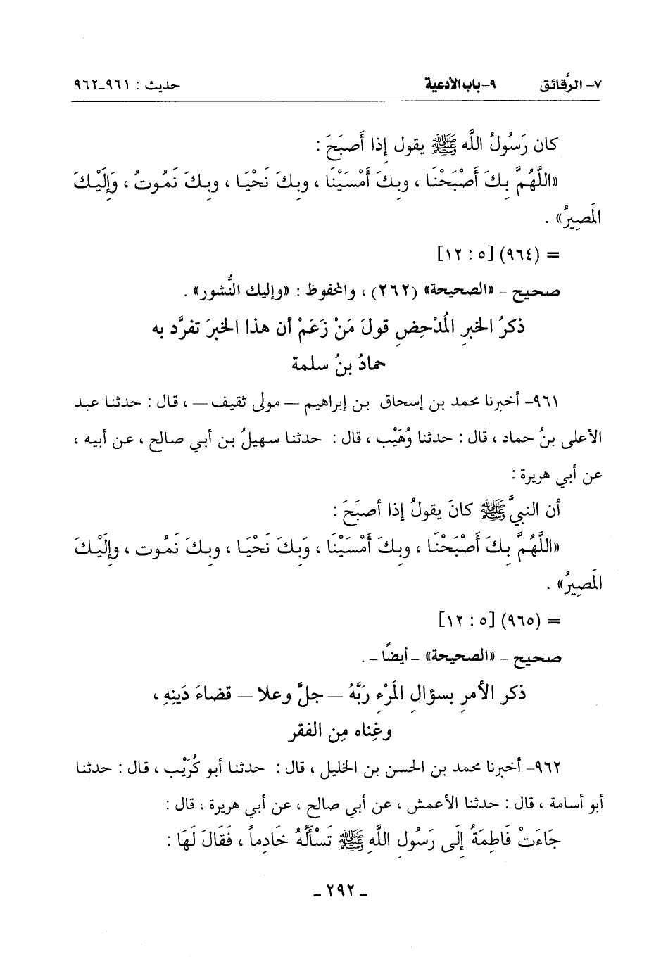 961 - أَخْبَرَنَا مُحَمَّدُ بْنُ إِسْحَاقَ بْنِ إِبْرَاهِيمَ مَوْلَى ثَقِيفٍ قَالَ: حَدَّثَنَا عَبْدُ الْأَعْلَى بْنُ حَمَّادٍ قَالَ: حَدَّثَنَا وُهَيْبٌ قَالَ: حَدَّثَنَا سُهَيْلُ بْنُ أَبِي صَالِحٍ عَنْ أَبِيهِ عَنْ أَبِي هُرَيْرَةَ:
