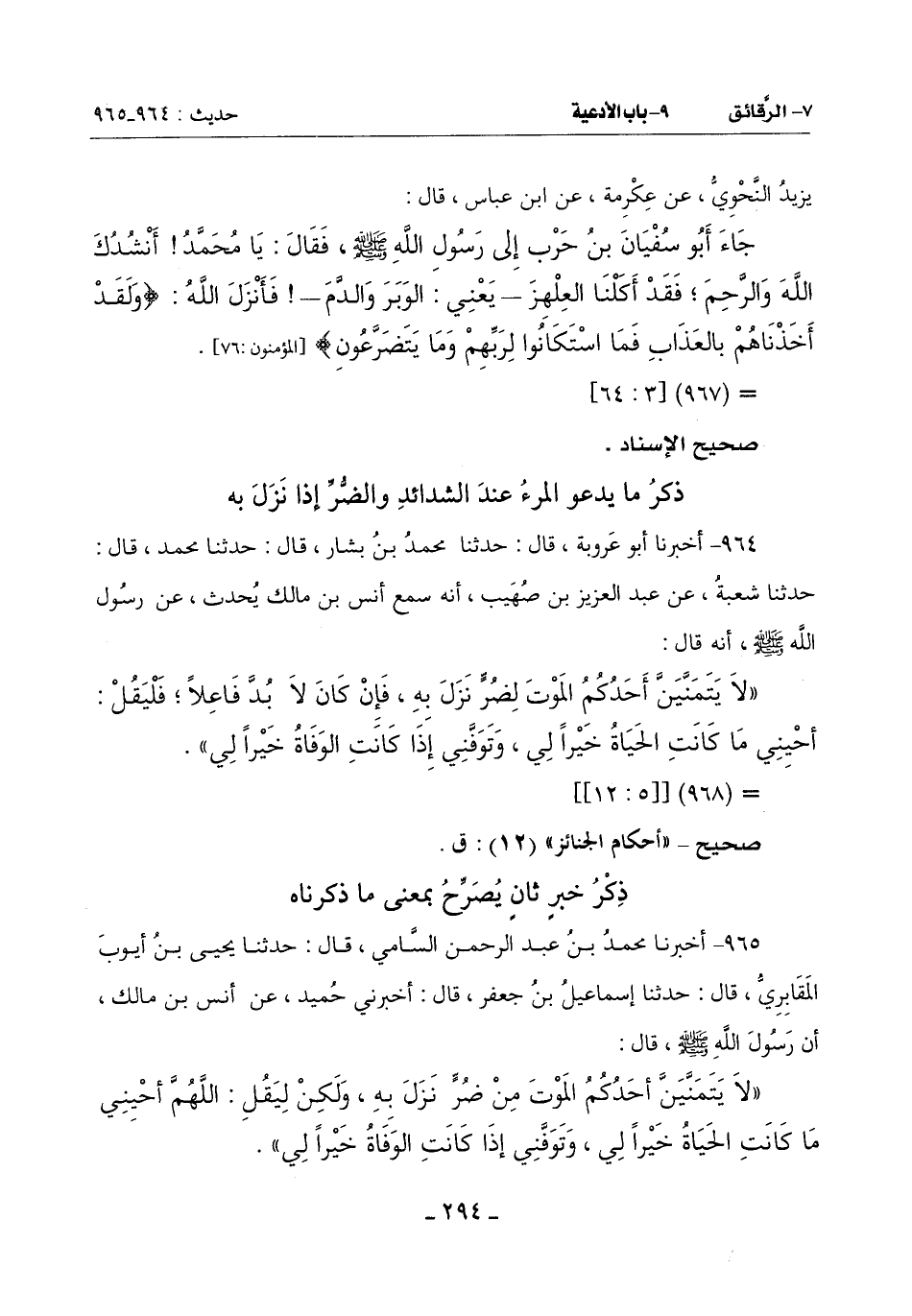 (لَا يَتَمَنَّيَنَّ أَحَدُكُمُ الْمَوْتَ مِنْ ضُرٍّ نَزَلَ بِهِ وَلَكِنْ لِيَقُلِ: اللَّهُمَّ أَحْيِنِي مَا كَانَتِ الْحَيَاةُ خَيْرًا لِي وَتَوَفَّنِي إِذَا كَانَتِ الْوَفَاةُ خَيْرًا لي) -[295]-