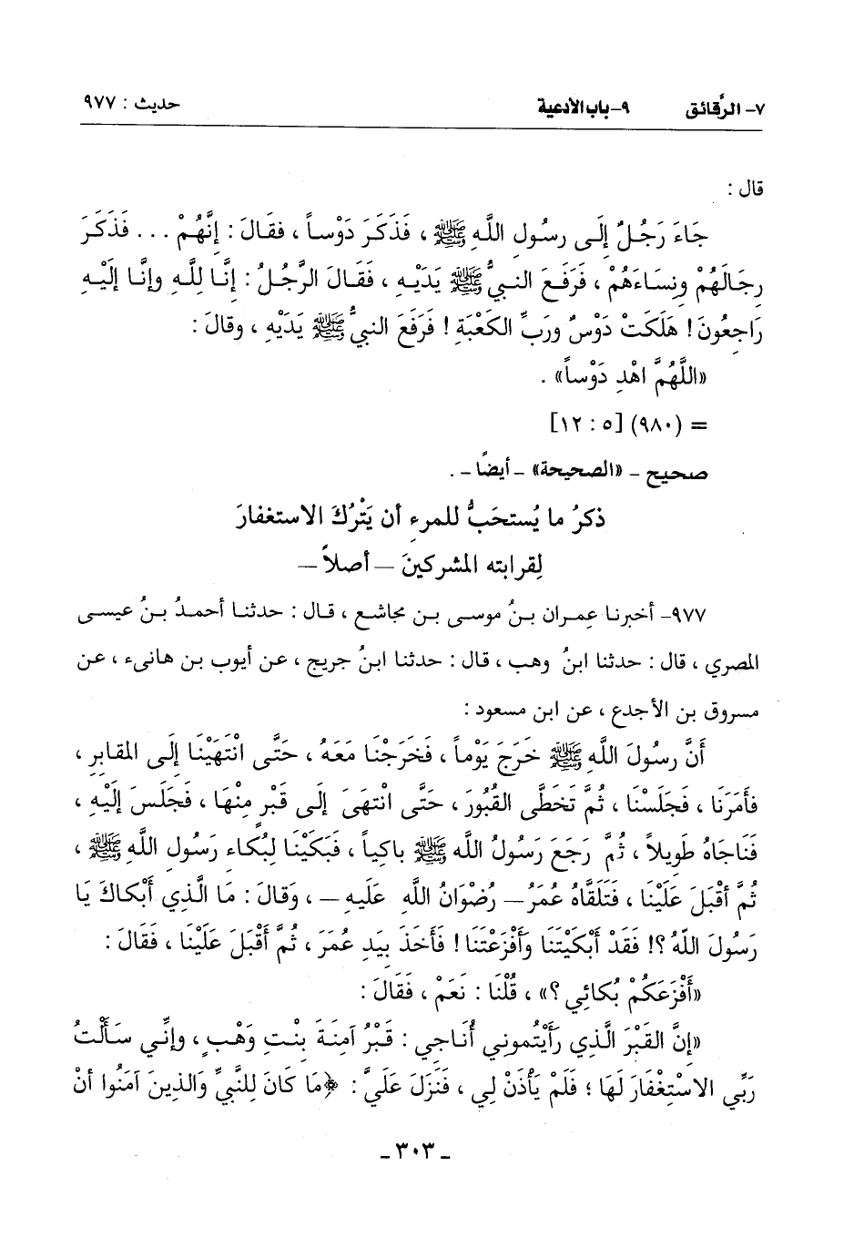 (إِنَّ الْقَبْرَ الَّذِي رَأَيْتُمُونِي أُنَاجِي قَبْرُ آمِنَةَ بِنْتِ وَهْبٍ وَإِنِّي سَأَلْتُ رَبِّي الِاسْتِغْفَارَ لَهَا فَلَمْ يَأْذَنْ لِي فَنَزَلَ عَلَيَّ: {مَا كَانَ لِلنَّبِيِّ وَالَّذِينَ آمَنُوا أَنْ -[304]- يَسْتَغْفِرُوا لِلْمُشْرِكِينَ} [التوبة: 113] فَأَخَذَنِي مَا يَأْخُذُ الْوَلَدُ لِلْوَالِدِ مِنَ الرِّقَّةِ فَذَلِكَ الَّذِي أَبْكَانِي أَلَا وَإِنِّي كُنْتُ نَهَيْتُكُمْ عَنْ زِيَارَةِ الْقُبُورِ فَزُورُوهَا فَإِنَّهَا تُزَهِّدُ في الدنيا وتُرَغِّبُ في الآخرة)