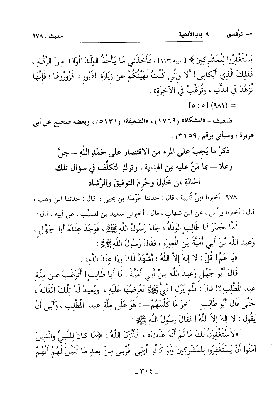 قَالَ أَبُو جَهْلٍ وَعَبْدُ اللَّهِ بْنُ أَبِي أُمَيَّةَ: يَا أَبَا طَالِبٍ أَتَرْغَبُ عَنْ مِلَّةِ عَبْدِ الْمُطَّلِبِ؟ قَالَ: فَلَمْ يَزَلِ النَّبِيُّ صَلَّى اللَّهُ عَلَيْهِ وَسَلَّمَ يَعْرِضُهَا عَلَيْهِ وَيُعِيدُ لَهُ تِلْكَ الْمَقَالَةَ حَتَّى قَالَ أَبُو طَالِبٍ آخِرَ مَا كَلَّمَهُمْ هُوَ عَلَى مِلَّةِ عَبْدِ الْمُطَّلِبِ وَأَبَى أَنْ يَقُولَ: لَا إِلَهَ إِلَّا اللَّهُ فَقَالَ رَسُولُ اللَّهِ صَلَّى اللَّهُ عَلَيْهِ وَسَلَّمَ: