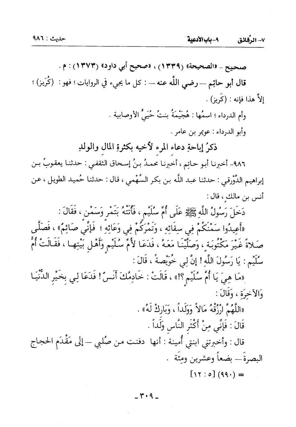 (مَا هِيَ يَا أُمَّ سُلَيْمٍ)؟ قَالَتْ: خَادِمُكَ أَنَسٌ فَدَعَا لِي بِخَيْرِ الدُّنْيَا وَالْآخِرَةِ وَقَالَ: