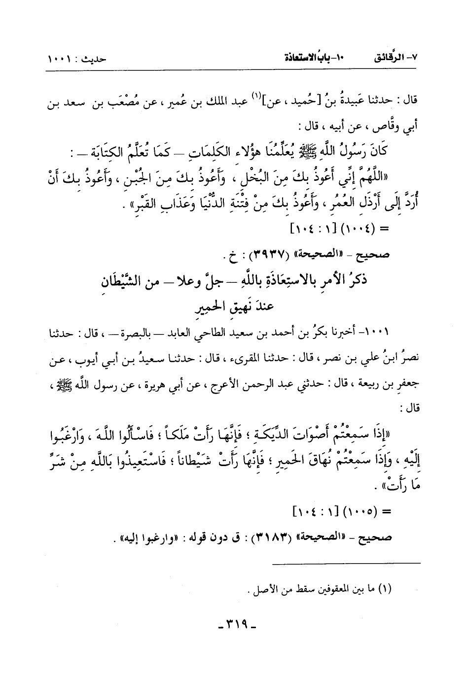 1001 - أَخْبَرَنَا بَكْرُ بْنُ أَحْمَدَ بْنِ سَعِيدٍ الطَّاحِيُّ الْعَابِدُ بِالْبَصْرَةِ قَالَ: حَدَّثَنَا نَصْرُ بْنُ عَلِيِّ بْنِ نَصْرٍ قَالَ: حَدَّثَنَا الْمُقْرِئُ قَالَ: حَدَّثَنَا سَعِيدُ بْنُ أَبِي أَيُّوبَ عَنْ جَعْفَرِ بْنِ رَبِيعَةَ قَالَ: حَدَّثَنِي عَبْدُ الرَّحْمَنِ الْأَعْرَجُ عَنْ أَبِي هُرَيْرَةَ عَنْ رَسُولِ اللَّهِ صَلَّى اللَّهُ عَلَيْهِ وَسَلَّمَ قَالَ: