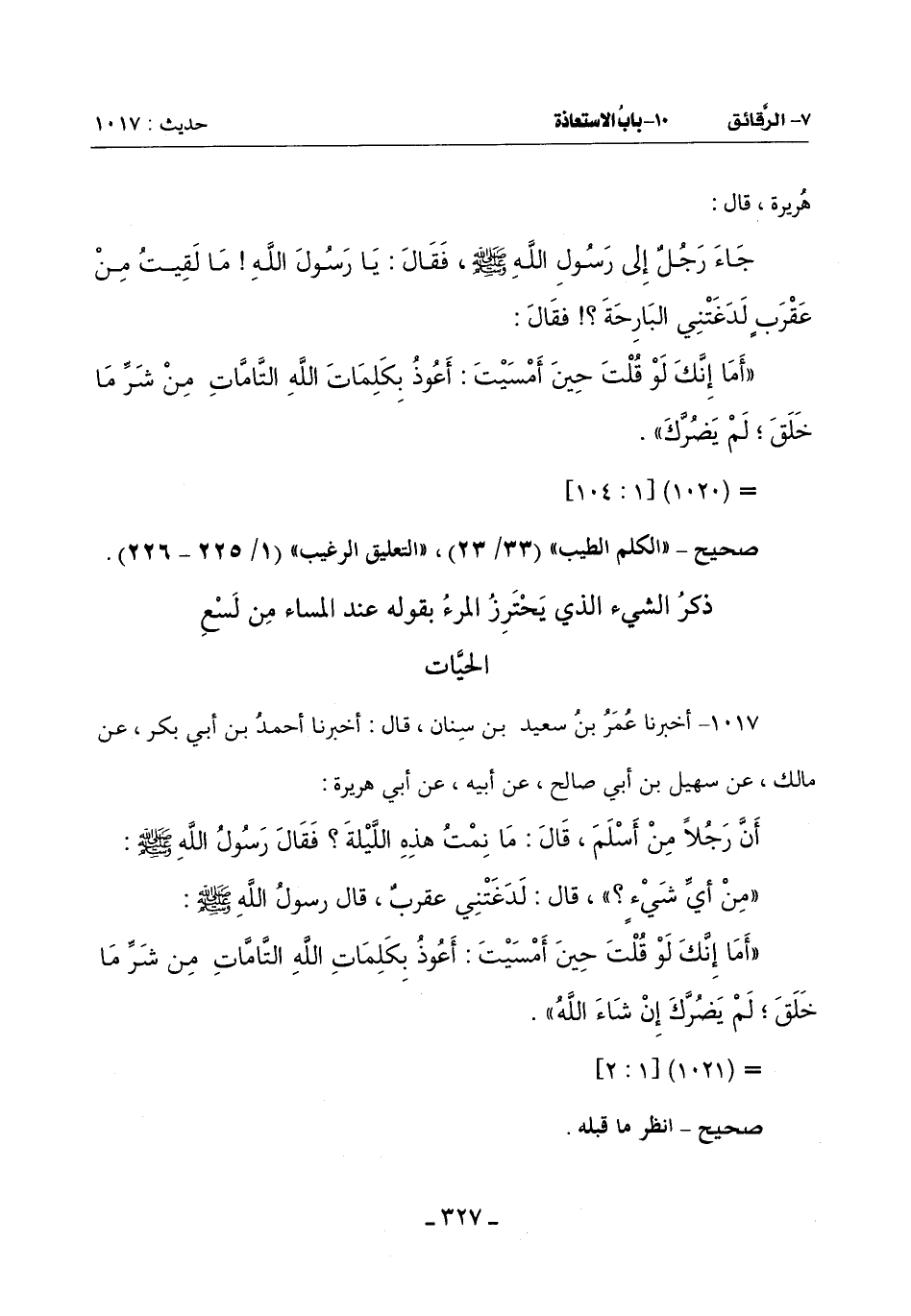 (أَمَا إِنَّكَ لَوْ قُلْتَ حِينَ أَمْسَيْتَ: أَعُوذُ بِكَلِمَاتِ اللَّهِ التَّامَّاتِ مِنْ شَرِّ مَا خَلَقَ لَمْ يَضُرَّكَ إِنْ شاء الله)