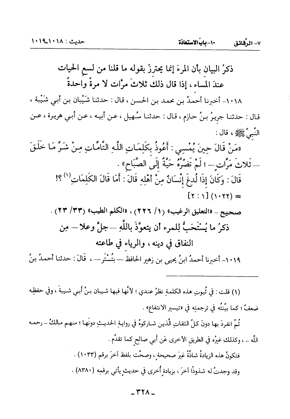 (مَنْ قَالَ حِينَ يُمْسِي: أَعُوذُ بِكَلِمَاتِ اللَّهِ التَّامَّاتِ مِنْ شَرِّ مَا خَلَقَ ثَلَاثَ مَرَّاتٍ لَمْ تَضُرَّهُ حَيَّةٌ إِلَى الصَّبَاحِ)