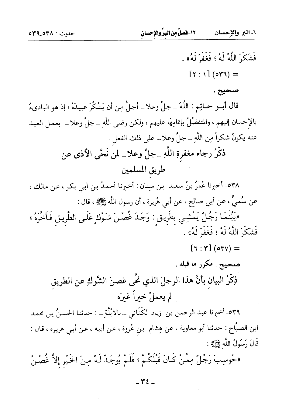 (حُوسِبَ رَجُلٌ مِمَّنْ كَانَ قَبْلَكُمْ فَلَمْ يُوجَدْ لَهُ مِنَ الْخَيْرِ إِلَّا غُصْنُ -[35]- شَوْكٍ كَانَ عَلَى الطَّرِيقِ كان يؤذي الناس فَعَزَلَهُ فغُفِرَ له)