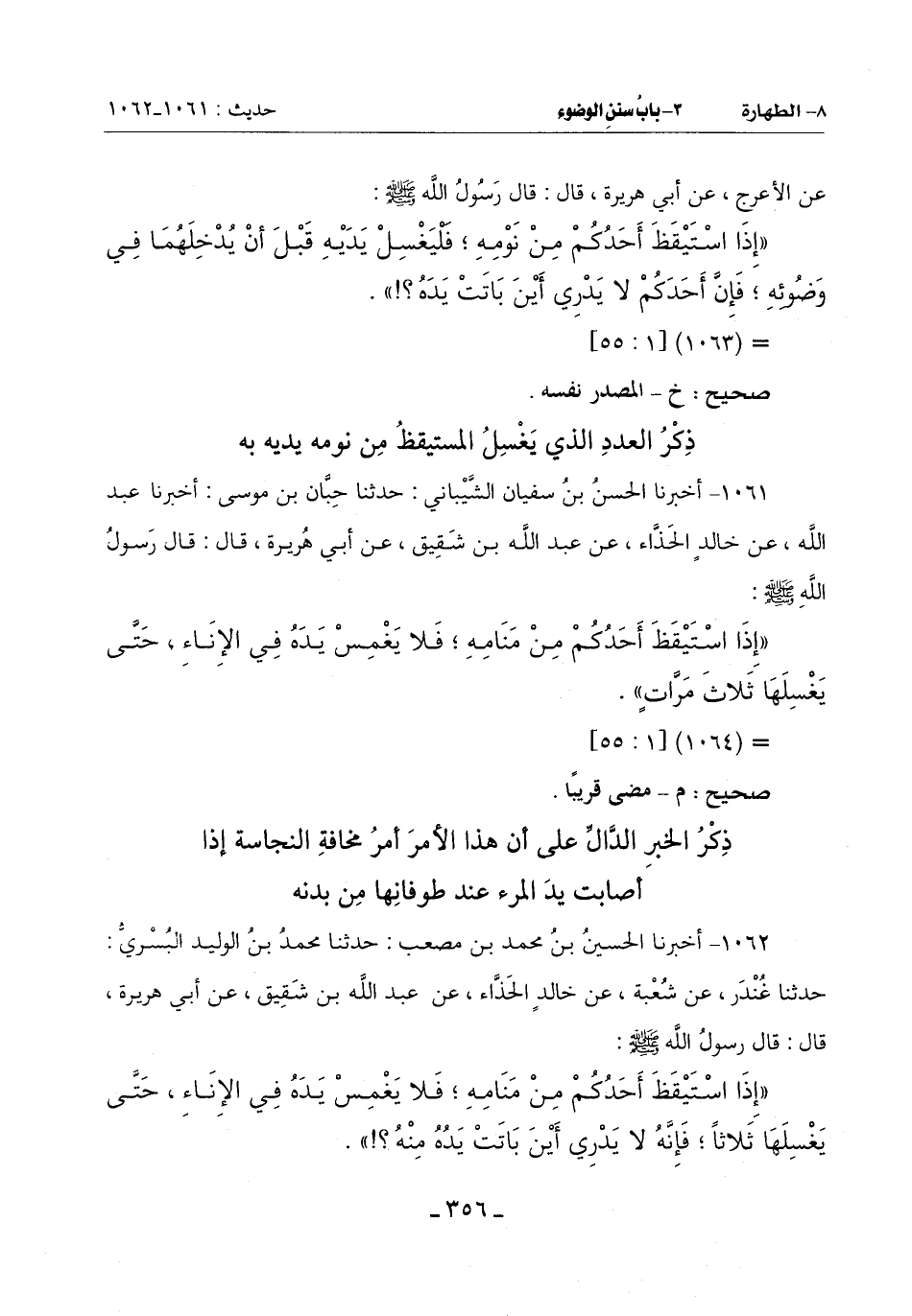 (إِذَا اسْتَيْقَظَ أَحَدُكُمْ مِنْ مَنَامِهِ فَلَا يَغْمِسْ يَدَهُ فِي الْإِنَاءِ حَتَّى يغسلها ثلاث مرات)