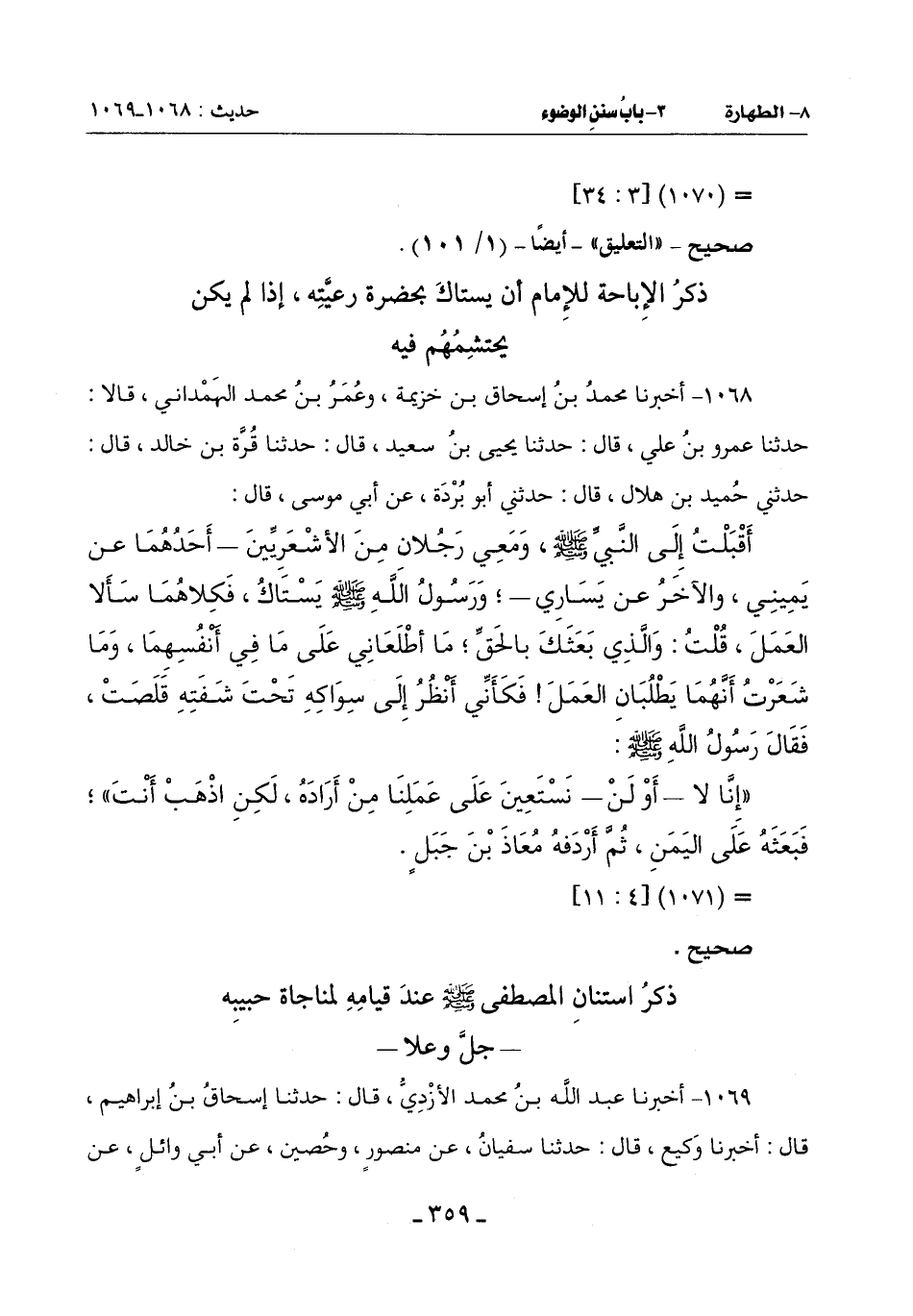 1068 - أَخْبَرَنَا مُحَمَّدُ بْنُ إِسْحَاقَ بْنِ خُزَيْمَةَ وَعُمَرُ بْنُ مُحَمَّدٍ الْهَمْدَانِيُّ قَالَا: حَدَّثَنَا عَمْرُو بْنُ عَلِيٍّ قَالَ: حَدَّثَنَا يَحْيَى بْنُ سَعِيدٍ قَالَ: حَدَّثَنَا قُرَّةُ بْنُ خَالِدٍ قَالَ: حَدَّثَنِي حُمَيْدُ بْنُ هِلَالٍ قَالَ: حَدَّثَنِي أَبُو بُرْدَةَ عَنْ أَبِي مُوسَى قَالَ: