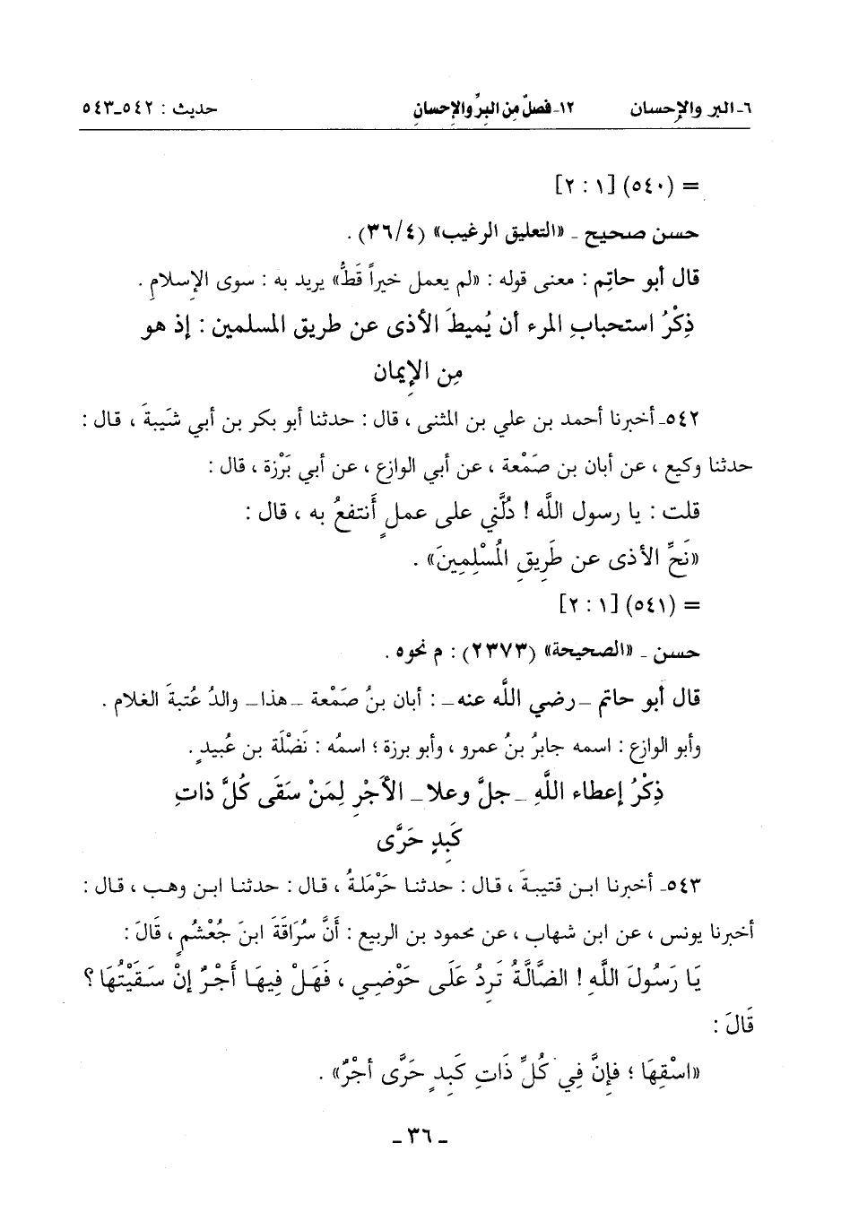 ذِكْرُ اسْتِحْبَابِ الْمَرْءِ أَنْ يُمِيطَ الْأَذَى عَنْ طَرِيقِ الْمُسْلِمِينَ إِذْ هُوَ مِنَ الْإِيمَانِ
