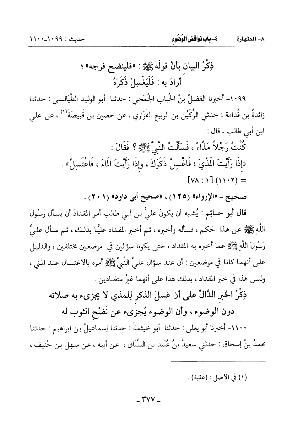 ذِكْرُ الْخَبَرِ الدَّالِّ عَلَى أَنَّ غَسْلَ الذَّكَرِ لِلْمَذْيِ لَا يُجْزِئُ بِهِ صَلَاتَهُ دُونَ الْوُضُوءِ وَأَنَّ الْوُضُوءَ يُجْزِئُ عَنْ نَضْحِ الثَّوْبِ لَهُ