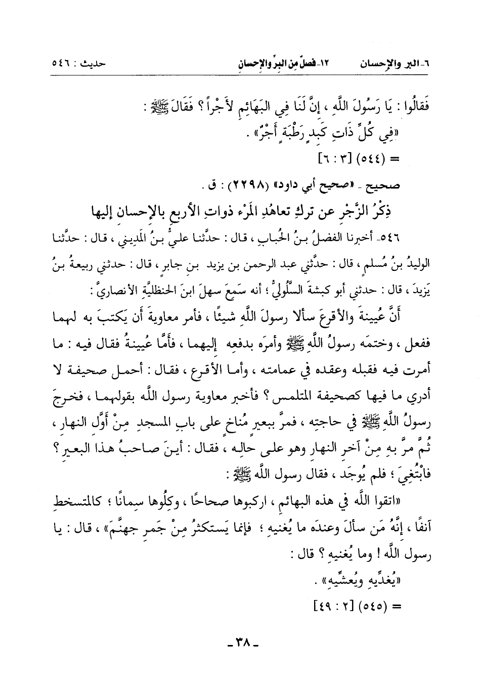 (اتَّقُوا اللَّهَ فِي هَذِهِ الْبَهَائِمِ ارْكَبُوهَا صِحَاحًا وَكُلُوهَا سِمَانًا كَالْمُتَسَخِّطِ آنِفًا إِنَّهُ مَنْ سَأَلَ وَعِنْدَهُ مَا يُغْنِيهِ فَإِنَّمَا يَسْتَكْثِرُ مِنْ جَمْرِ جَهَنَّمَ) قَالَ: يَا رَسُولَ الله وما يغنيه؟ قال: