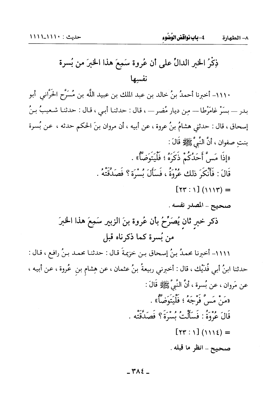 1110 - أَخْبَرَنَا أَحْمَدُ بْنُ خَالِدِ بْنِ عَبْدِ الْمَلِكِ بْنِ عُبَيْدِ اللَّهِ بْنِ مُسَرَّح الْحَرَّانِيُّ أَبُو بدر ـ بسَرْ غامَرْطا ـ مِنْ دِيَارِ مُضَرَ ـ قَالَ: حَدَّثَنَا أَبِي قَالَ: حَدَّثَنَا شُعَيْبُ بْنُ إِسْحَاقَ قَالَ: حَدَّثَنِي هِشَامُ بْنُ عُرْوَةَ عَنْ أَبِيهِ أَنَّ مَرْوَانَ بْنَ الْحَكَمِ حَدَّثَهُ عَنْ بُسْرَةَ بِنْتِ صَفْوَانَ أَنَّ النَّبِيَّ صَلَّى اللَّهُ عَلَيْهِ وَسَلَّمَ قَالَ: