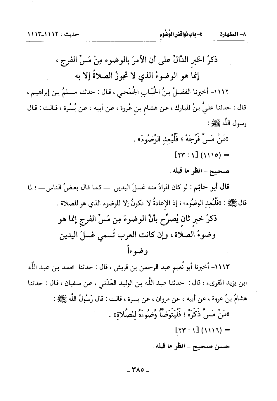 1113 - أَخْبَرَنَا أَبُو نُعَيْمٍ عَبْدُ الرَّحْمَنِ بْنُ قُرَيْشٍ قَالَ: حَدَّثَنَا مُحَمَّدُ بْنُ عَبْدِ اللَّهِ بْنِ يَزِيدَ الْمُقْرِئُ قَالَ: حَدَّثَنَا عَبْدُ اللَّهِ بْنُ الْوَلِيدِ الْعَدَنِيُّ عَنْ سُفْيَانَ قَالَ: حَدَّثَنَا هِشَامُ بْنُ عُرْوَةَ عَنْ أَبِيهِ عن مروان عن بُسْرَةَ قَالَتْ: قَالَ رَسُولُ اللَّهِ صَلَّى اللَّهُ عَلَيْهِ وَسَلَّمَ: