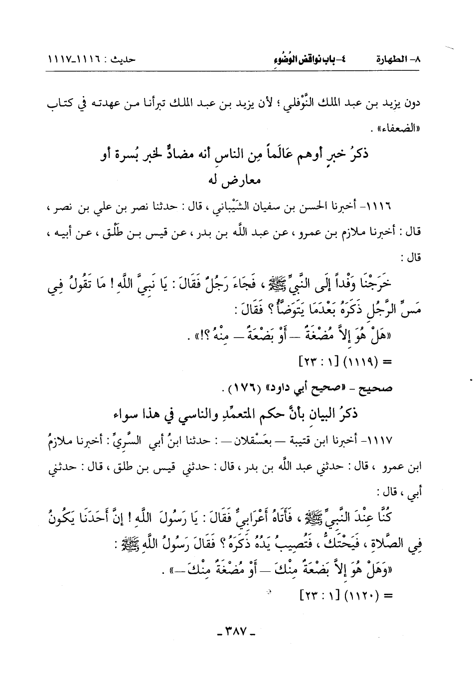1116 - أَخْبَرَنَا الْحَسَنُ بْنُ سُفْيَانَ الشَّيْبَانِيُّ قَالَ: حَدَّثَنَا نَصْرُ بْنُ عَلِيِّ بْنِ نَصْرٍ قَالَ: أَخْبَرَنَا ملازم بن عمرو عن عَبْدُ اللَّهِ بْنُ بَدْرٍ عَنْ قَيْسِ بْنِ طَلْقٍ عَنْ أَبِيهِ قَالَ:
