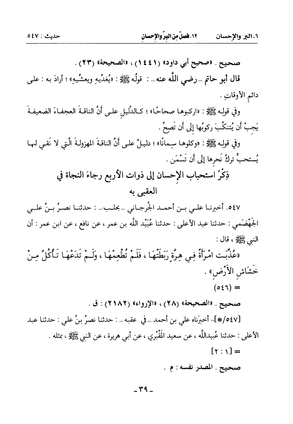 ذِكْرُ اسْتِحْبَابِ الْإِحْسَانِ إِلَى ذَوَاتِ الْأَرْبَعِ رَجَاءَ النَّجَاةِ فِي الْعُقْبَى بِهِ