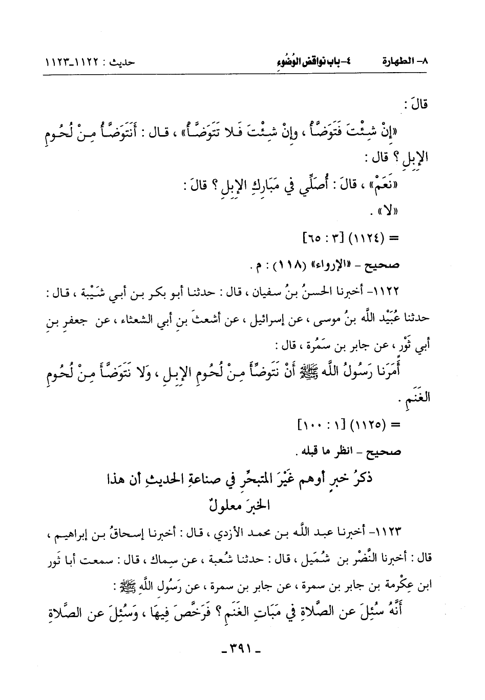 (أَمَرَنَا رَسُولُ اللَّهِ صَلَّى اللَّهُ عَلَيْهِ وسلم إن نَتَوَضَّأَ مِنْ لُحُومِ الْإِبِلِ وَلَا نَتَوَضَّأَ مِنْ لحوم الغنم)