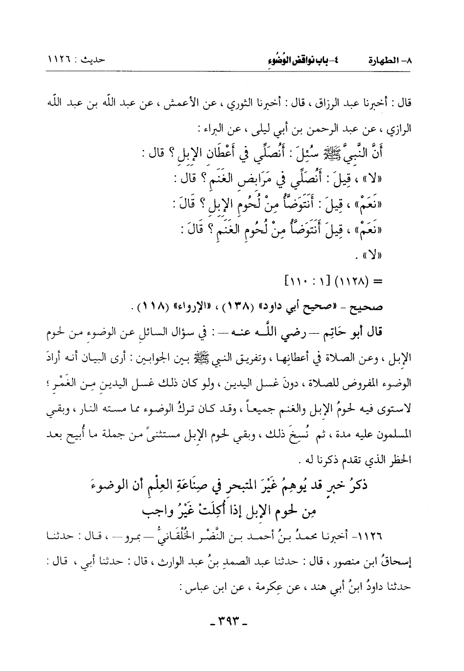 ذِكْرُ خَبَرٍ قَدْ يُوهِمُ غَيْرَ الْمُتَبَحِّرِ فِي صِنَاعَةِ الْعِلْمِ أَنَّ الْوُضُوءَ مِنْ لُحُومِ الْإِبِلِ إِذَا أُكلت غَيْرُ وَاجِبٍ