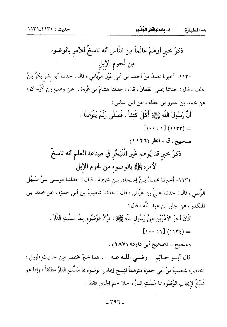 قَالَ أَبُو حَاتِمٍ رَضِيَ اللَّهُ عَنْهُ: هَذَا خَبَرٌ مُخْتَصَرٌ مِنْ حَدِيثٍ طَوِيلٍ اخْتَصَرَهُ شُعَيْبُ بْنُ أَبِي حَمْزَةَ مُتَوَهِّمًا لِنَسْخِ إِيجَابِ الْوُضُوءِ مِمَّا مَسَّتِ النَّارُ مُطْلَقًا وَإِنَّمَا هُوَ نَسْخٌ لِإِيجَابِ الْوُضُوءِ مِمَّا مَسَّتِ النَّارُ خَلَا لَحْمِ الجزور فقط