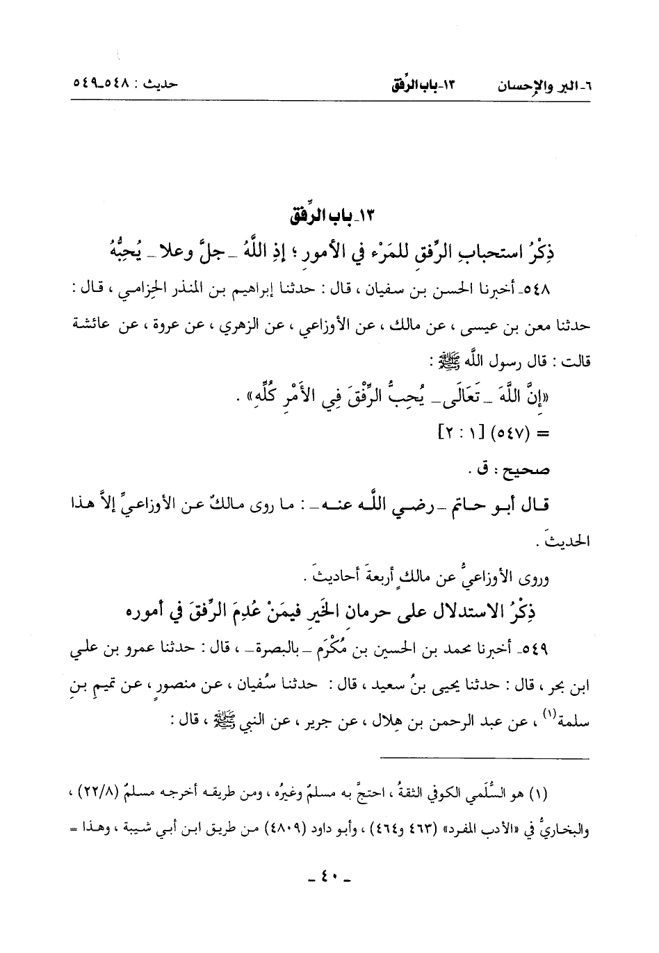 549 - أَخْبَرَنَا مُحَمَّدُ بْنُ الْحُسَيْنِ بْنِ مُكْرَمٍ بِالْبَصْرَةِ قَالَ: حَدَّثَنَا عَمْرُو بْنُ عَلِيِّ بْنِ بَحْرٍ قَالَ: حَدَّثَنَا يَحْيَى بْنُ سَعِيدٍ قَالَ: حَدَّثَنَا سُفْيَانُ عَنْ مَنْصُورٍ عَنْ تَمِيمِ بْنِ سَلَمَةَ (¬1) عَنْ عَبْدِ الرَّحْمَنِ بْنِ هِلَالٍ عَنْ جَرِيرٍ عَنِ النَّبِيِّ صَلَّى اللَّهُ عَلَيْهِ وَسَلَّمَ قَالَ: -[41]- (من يُحْرَمِ الرِّفْقَ يُحْرَمِ الخير)