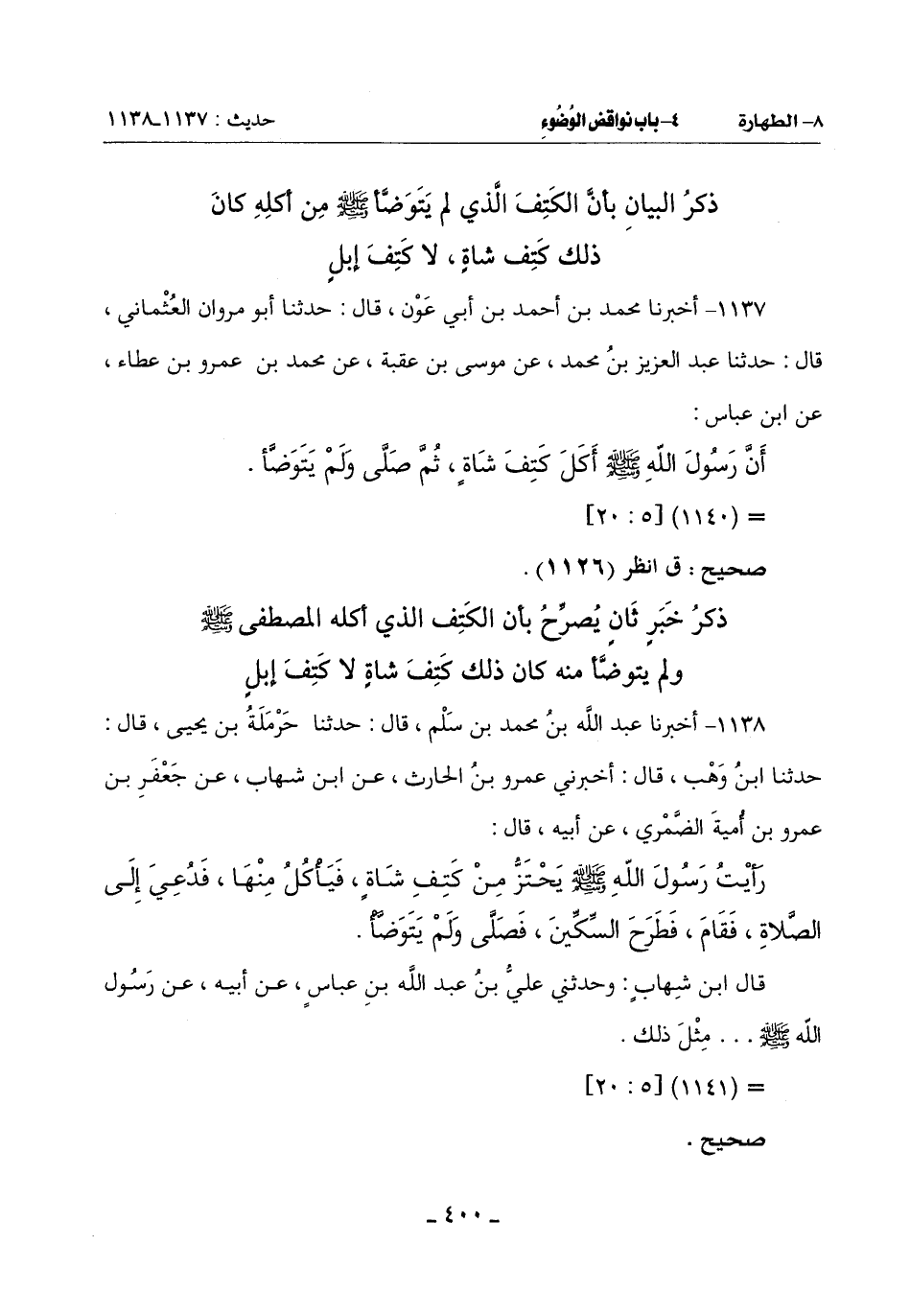 ذِكْرُ الْبَيَانِ بِأَنَّ الْكَتِفَ الَّذِي لَمْ يَتَوَضَّأْ صَلَّى اللَّهُ عَلَيْهِ وَسَلَّمَ مِنْ أَكْلِهِ كَانَ كَتِفَ شَاةٍ لَا كَتِفَ إِبِلٍ