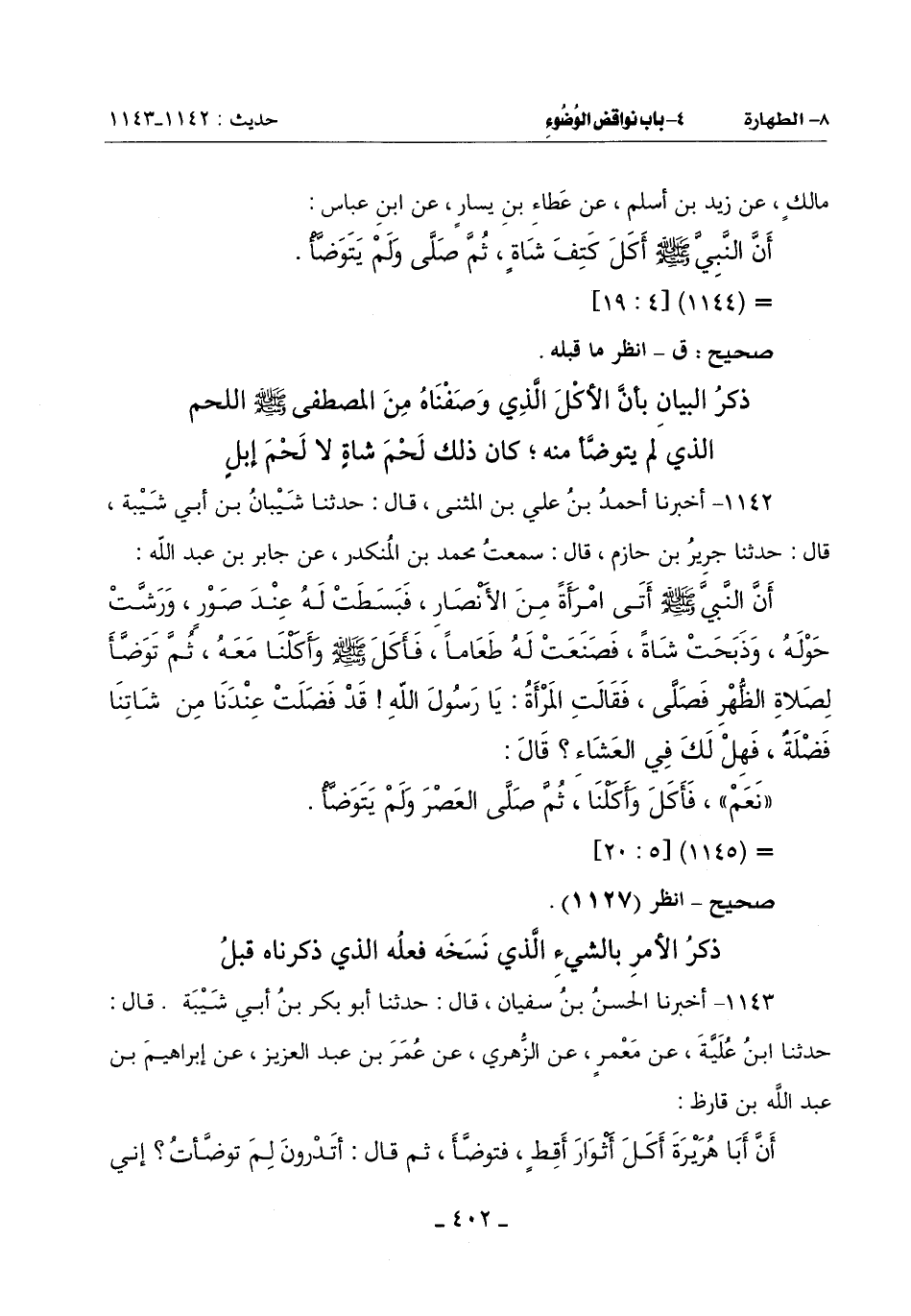 ذِكْرُ الْبَيَانِ بِأَنَّ الْأَكْلَ الَّذِي وَصَفْنَاهُ مِنَ الْمُصْطَفَى صَلَّى اللَّهُ عَلَيْهِ وَسَلَّمَ اللَّحْمَ الَّذِي لَمْ يَتَوَضَّأْ مِنْهُ كَانَ ذَلِكَ لَحْمَ شَاةٍ لَا لَحْمَ إِبِلٍ