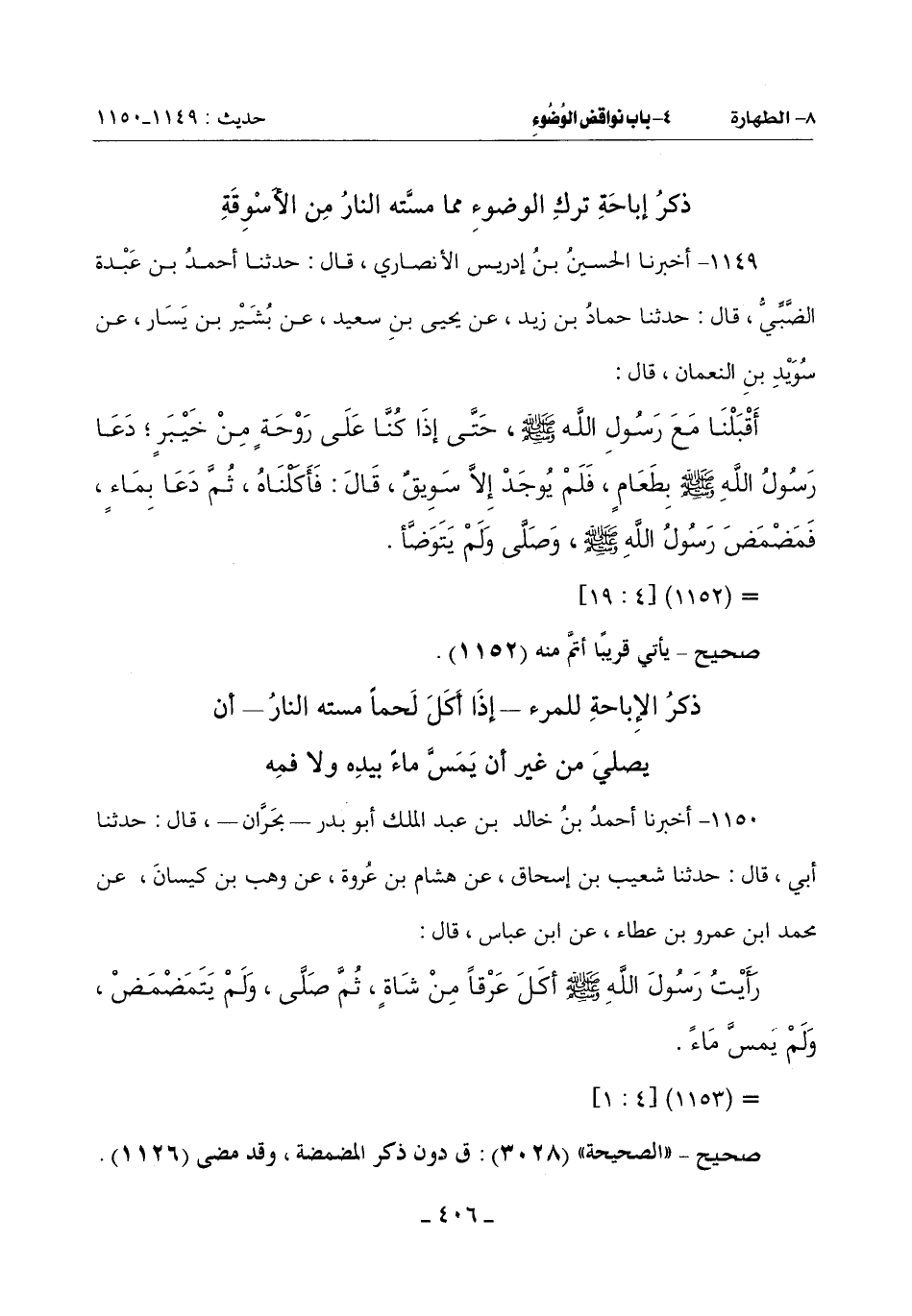 1149 - حَدَّثَنَا الْحُسَيْنُ بْنُ إِدْرِيسَ الْأَنْصَارِيُّ قَالَ: حَدَّثَنَا أَحْمَدُ بْنُ عَبْدَةَ الضَّبِّيُّ قَالَ: حَدَّثَنَا حَمَّادُ بْنُ زَيْدٍ عَنْ يَحْيَى بْنِ سَعِيدٍ عَنْ بَشِيرِ بْنِ يَسَارٍ عَنْ سُوَيْدِ بْنِ النُّعْمَانِ قَالَ: