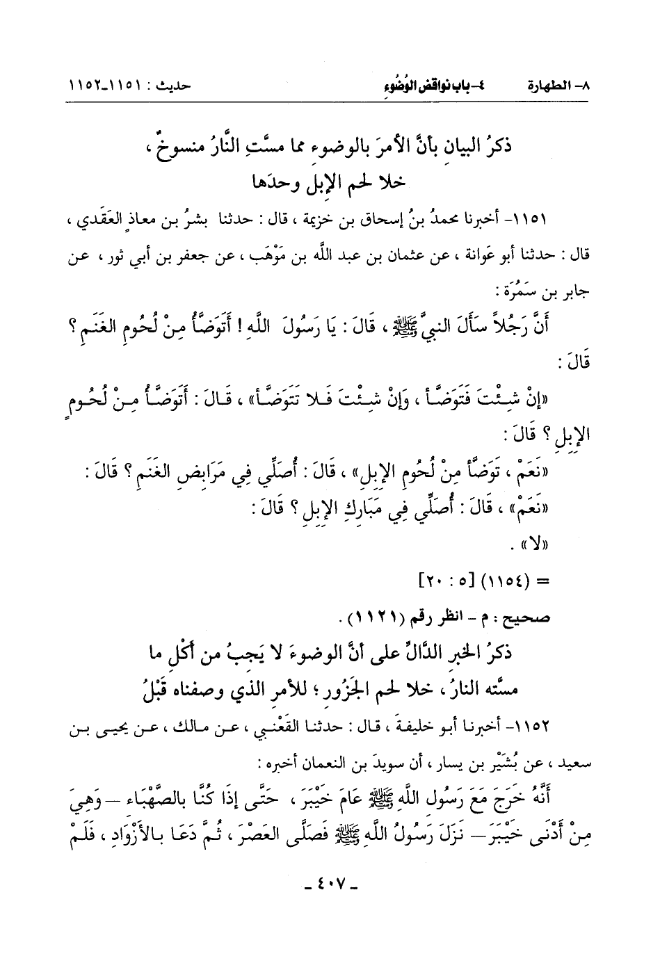 (نَعَمْ تَوَضَّأْ مِنْ لُحُومِ الْإِبِلِ) قَالَ: أُصلي فِي مَرَابِضِ الْغَنَمِ؟ قَالَ: