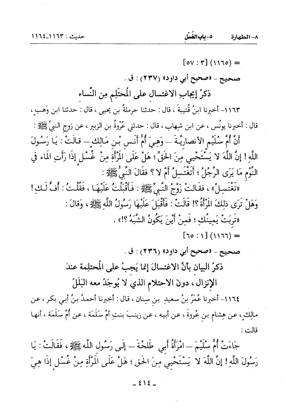 جَاءَتْ أُمُّ سُلَيْمٍ امْرَأَةُ أَبِي طَلْحَةَ إِلَى رَسُولِ اللَّهِ صَلَّى اللَّهُ عَلَيْهِ وَسَلَّمَ فَقَالَتْ: يَا رَسُولَ اللَّهِ إِنَّ اللَّهَ لَا يَسْتَحْيِي مِنَ الْحَقِّ هَلْ عَلَى الْمَرْأَةِ مِنْ غُسلٍ إِذَا هِيَ -[415]- احْتَلَمَتْ؟ قَالَ: