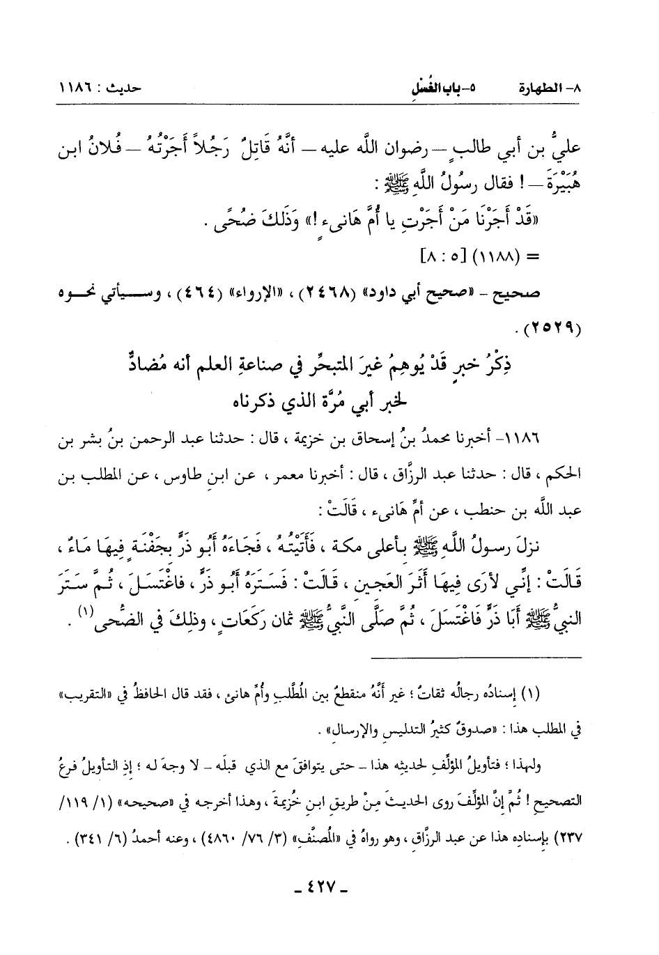 قَالَ أَبُو حَاتِمٍ رَضِيَ اللَّهُ عَنْهُ: يُشْبِهُ أَنْ يَكُونَ الْمُصْطَفَى صَلَّى اللَّهُ عَلَيْهِ وَسَلَّمَ حَيْثُ اغْتَسَلَ يَوْمَ الْفَتْحِ سَتَرْتَهُ فَاطِمَةُ ابْنَتُهُ وَأَبُو ذَرٍّ جَمِيعًا بِثَوْبٍ فأدَّى أَبُو مُرَّةَ مَوْلَى أُمِّ هَانِئٍ الْخَبَرَ بِذِكْرِ فَاطِمَةَ وَحْدَهَا وَأَدَّى الْمُطَّلِبُ بْنُ حَنْطَبٍ الْخَبَرَ بِذِكْرِ أَبِي ذَرٍّ وَحْدَهُ حَتَّى لَا يَكُونَ بَيْنَ الْخَبَرَيْنِ تَضَادُّ وَلَا تَهَاتُرٌ لِأَنَّ الِاغْتِسَالَ مِنْهُ صَلَّى اللَّهُ عَلَيْهِ وَسَلَّمَ فِي ذَلِكَ الْيَوْمِ كَانَ مَرَّةً وَاحِدَةً فَلَمَّا أَرَادَ (¬2) أَبُو ذَرٍّ أَنْ يَغْتَسِلَ سَتَرَهُ النَّبِيُّ صَلَّى اللَّهُ عَلَيْهِ وَسَلَّمَ دون فاطمة