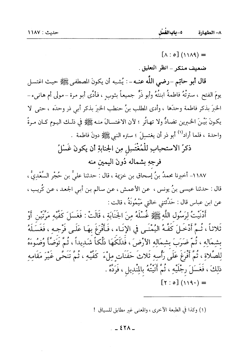 1187 - أَخْبَرَنَا مُحَمَّدُ بْنُ إِسْحَاقَ بْنِ خُزَيْمَةَ قَالَ: حَدَّثَنَا عَلِيُّ بْنُ حُجْرٍ السَّعْدِيُّ قَالَ: حَدَّثَنَا عِيسَى بْنُ يُونُسَ عَنِ الْأَعْمَشِ عَنْ سَالِمِ بْنِ أَبِي الْجَعْدِ عَنْ كُرَيْبٍ عَنِ ابْنِ عَبَّاسٍ قَالَ: حَدَّثَتْنِي خَالَتِي مَيْمُونَةُ قَالَتْ: