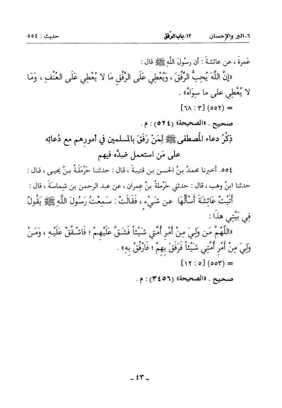 (اللَّهُمَّ مَنْ وَلِيَ مِنْ أَمْرِ أُمَّتِي شَيْئًا فشقَّ عَلَيْهِمْ فاشقُق عَلَيْهِ وَمَنْ وَلِيَ مِنْ أَمَرِ أُمَّتِي شَيْئًا فَرَفَقَ بِهِمْ فَارْفُقْ به)
