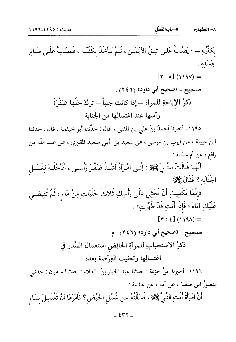 (إِنَّمَا يَكْفِيكِ أَنْ تَحْثِي عَلَى رَأْسِكِ ثَلَاثَ حَثَيَاتٍ مِنْ مَاءٍ ثُمَّ تُفِيضِي عَلَيْكِ الْمَاءَ فَإِذَا أَنْتِ قَدْ طهرْتِ)