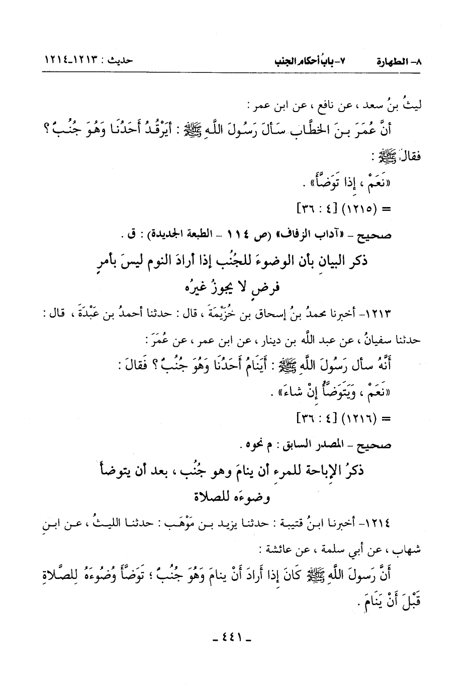 أَنَّ رَسُولَ اللَّهِ صَلَّى اللَّهُ عَلَيْهِ وَسَلَّمَ كَانَ إِذَا أَرَادَ أَنْ يَنَامَ وَهُوَ جُنُبٌ تَوَضَّأَ وُضُوءَهُ لِلصَّلَاةِ قَبْلَ أن ينام -[442]-