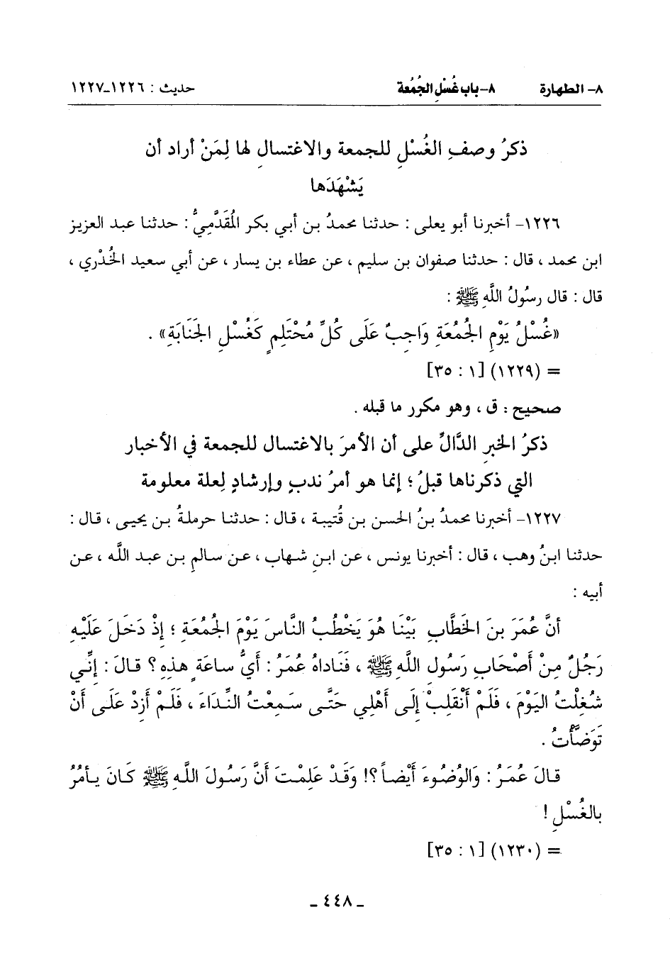 قَالَ أَبُو حَاتِمٍ رَضِيَ اللَّهُ عَنْهُ: فِي هَذَا الْخَبَرِ دَلِيلٌ صَحِيحٌ عَلَى نَفْيِ إِيجَابِ الْغُسْلِ لِلْجُمُعَةِ عَلَى مَنْ يَشْهَدُهَا لِأَنَّ عُمَرَ بْنَ الْخَطَّابِ كَانَ يَخْطُبُ إِذْ دَخَلَ الْمَسْجِدَ عُثْمَانُ بْنُ عَفَّانَ فَأَخْبَرَهُ أَنَّهُ مَا زَادَ عَلَى أَنْ تَوَضَّأَ ثُمَّ أَتَى الْمَسْجِدَ فَلَمْ يَأْمُرْهُ عُمَرُ وَلَا أَحَدٌ مِنَ الصَّحَابَةِ بِالرُّجُوعِ وَالِاغْتِسَالِ لِلْجُمُعَةِ ثُمَّ الْعَوْدِ إِلَيْهَا فَفِي إِجْمَاعِهِمْ عَلَى مَا وَصَفْنَا أَبْيَنُ الْبَيَانِ بِأَنَّ الْأَمْرَ كَانَ مِنَ الْمُصْطَفَى صَلَّى اللَّهُ عَلَيْهِ وَسَلَّمَ بِالِاغْتِسَالِ لِلْجُمُعَةِ أَمْرُ نَدْبٍ لَا حَتْمٍ