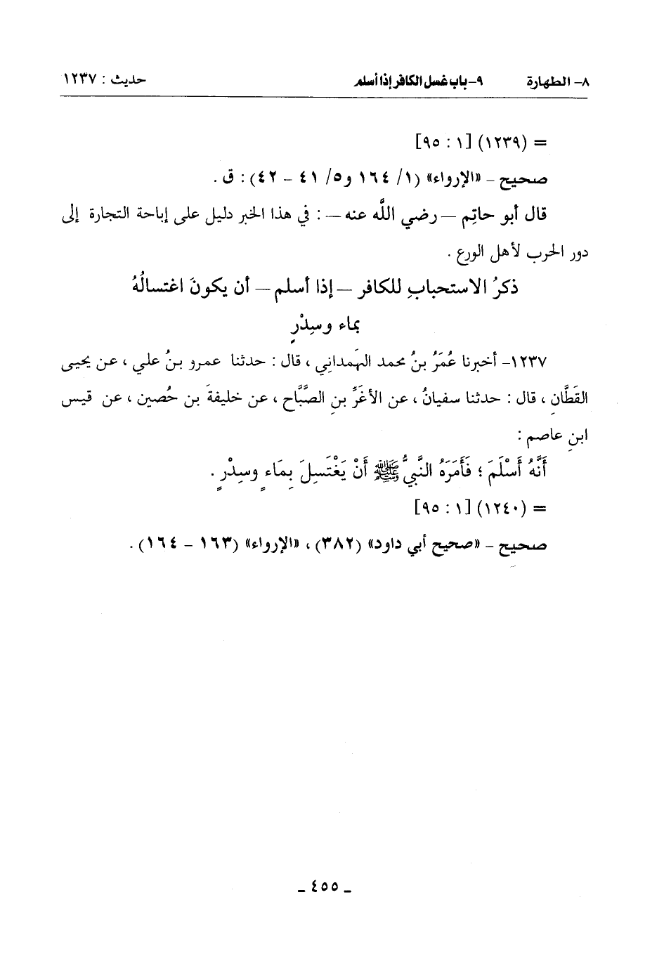 أَنَّهُ أَسْلَمَ فَأَمَرَهُ النَّبِيُّ صَلَّى اللَّهُ عَلَيْهِ وَسَلَّمَ أَنْ يغتسل بماء وسدر