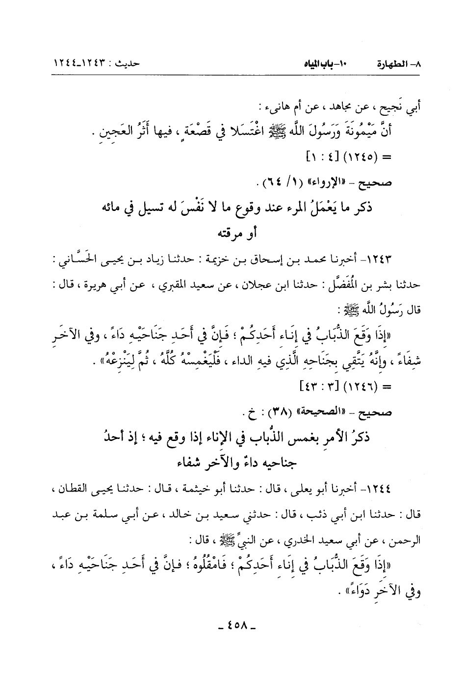 (إِذَا وَقَعَ الذُّبَابُ فِي إِنَاءِ أَحَدِكُمْ فامْقُلُوهُ فَإِنَّ فِي أَحَدِ جَنَاحَيْهِ دَاءٌ وَفِي الْآخَرِ دواء) -[459]-