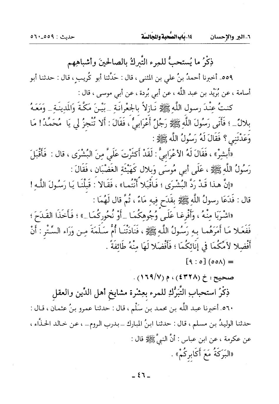 ذِكْرُ اسْتِحْبَابِ التَّبَرُّكِ لِلْمَرْءِ بِعِشْرَةِ مَشَايِخِ أَهْلِ الدين والعقل