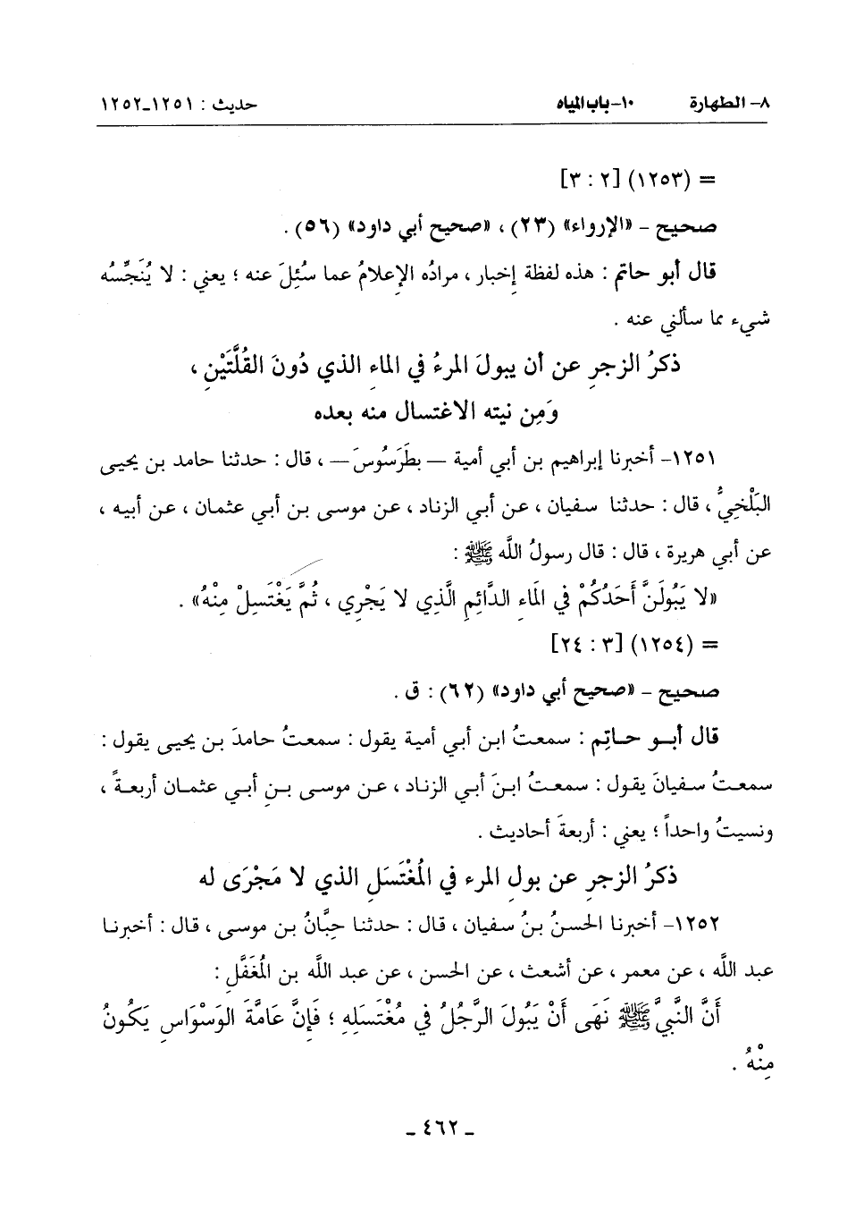 أَنَّ النَّبِيَّ صَلَّى اللَّهُ عَلَيْهِ وَسَلَّمَ نَهَى أَنْ يَبُولَ الرَّجُلُ فِي مغتسله فإن عامة الوسواس يكون منه -[463]-