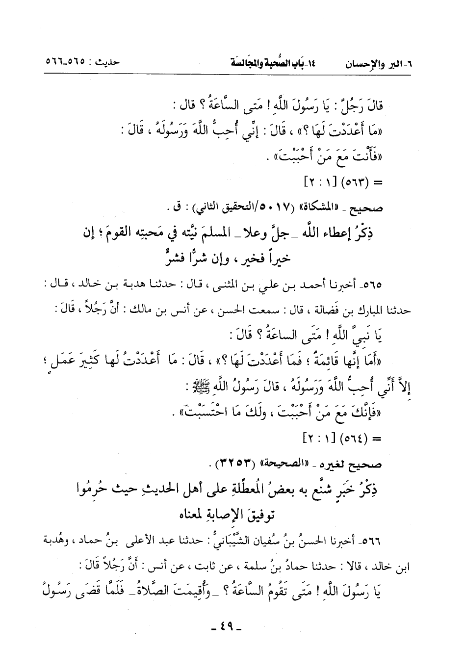 565 - أَخْبَرَنَا أَحْمَدُ بْنُ عَلِيِّ بْنِ الْمُثَنَّى قَالَ: حَدَّثَنَا هُدْبَةُ بْنُ خَالِدٍ قَالَ: حَدَّثَنَا الْمُبَارَكُ بْنُ فَضَالَةَ قَالَ: سَمِعْتُ الْحَسَنَ عَنْ أَنَسِ بْنِ مَالِكٍ: أَنَّ رَجُلًا قَالَ: